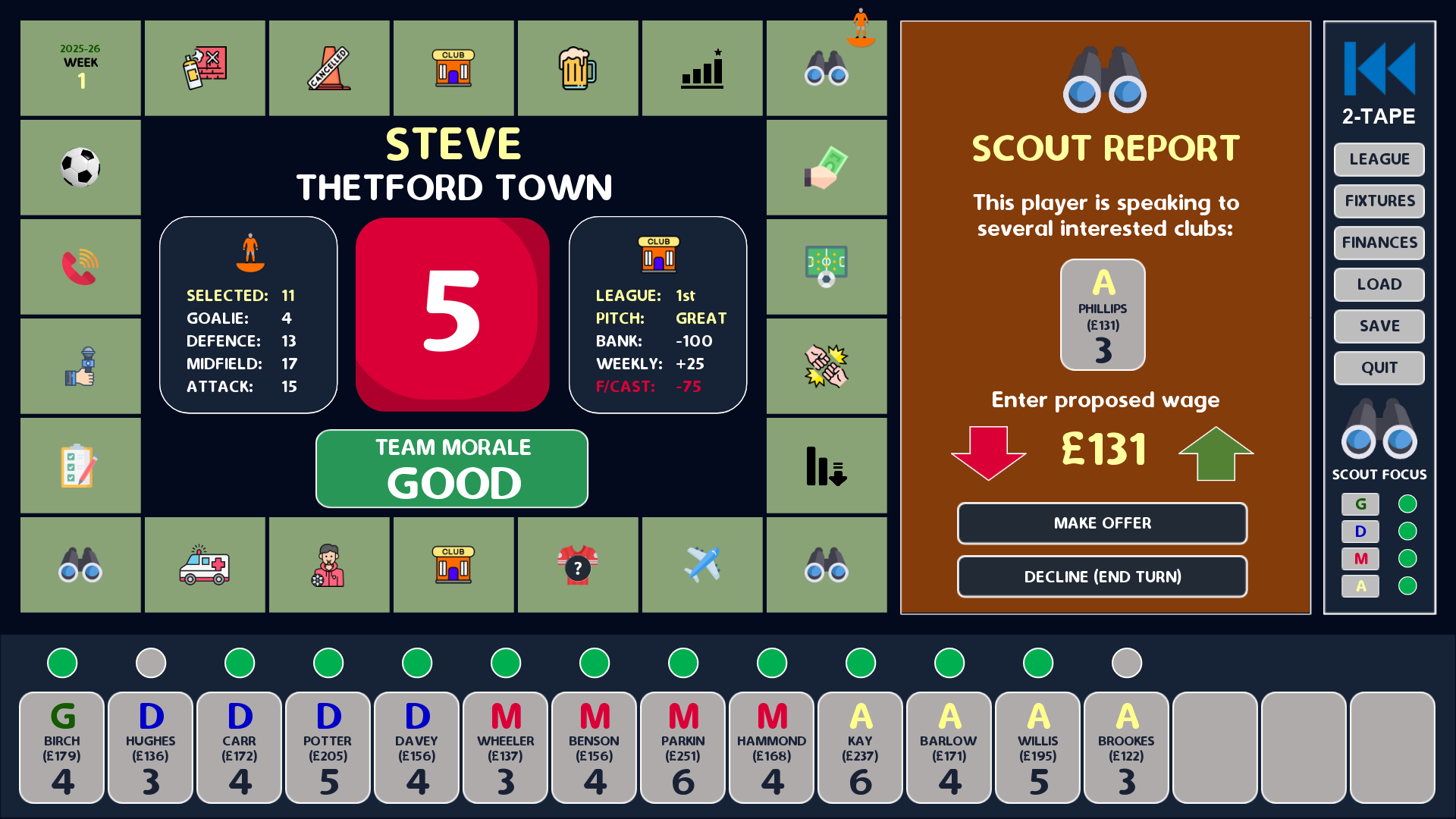 As this is non-league football, there are no player contracts or transfer fees. However, every week brings a variety of other challenges for you to manage. The life of a non-league manager is far from easy!